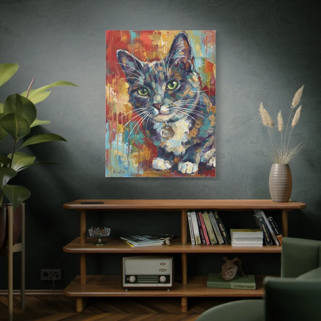 This vibrant impasto portrait of Koda, the cat, captures an intense, lively spirit through a mosaic of bold, affectionate strokes.