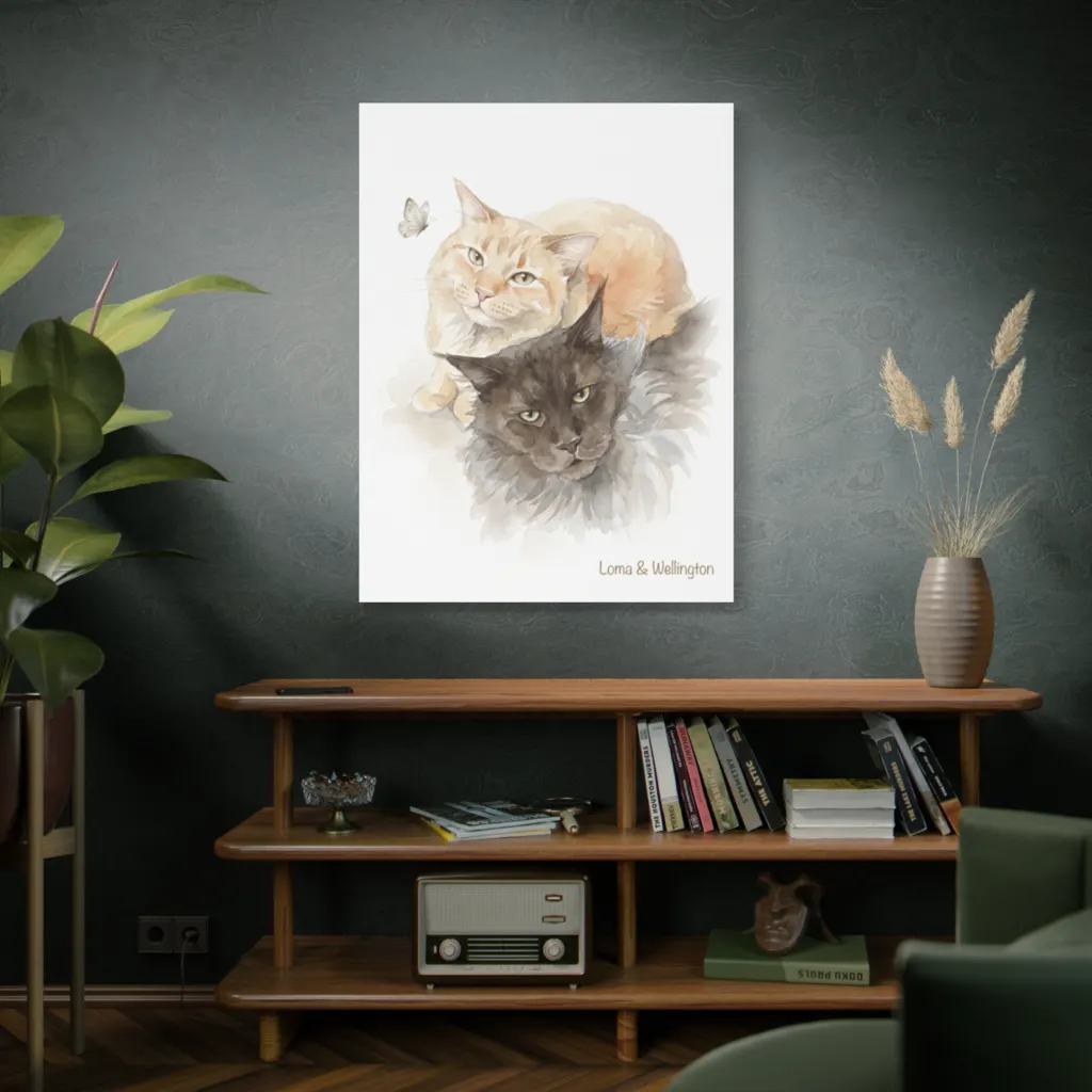 Soft watercolor captures two watchful, fluffy felines and a butterfly, exuding a serene, gentle charm. Loma and Wellington demonstrate the full spectrum of feline engagement: curious delight and majestic indifference.