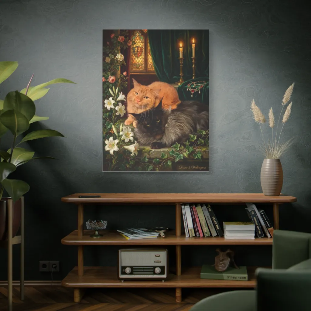 Opulent Pre-Raphaelite style elevates two majestic felines amidst gothic florals and candlelight, evoking a mood of whimsical, ancient royalty.