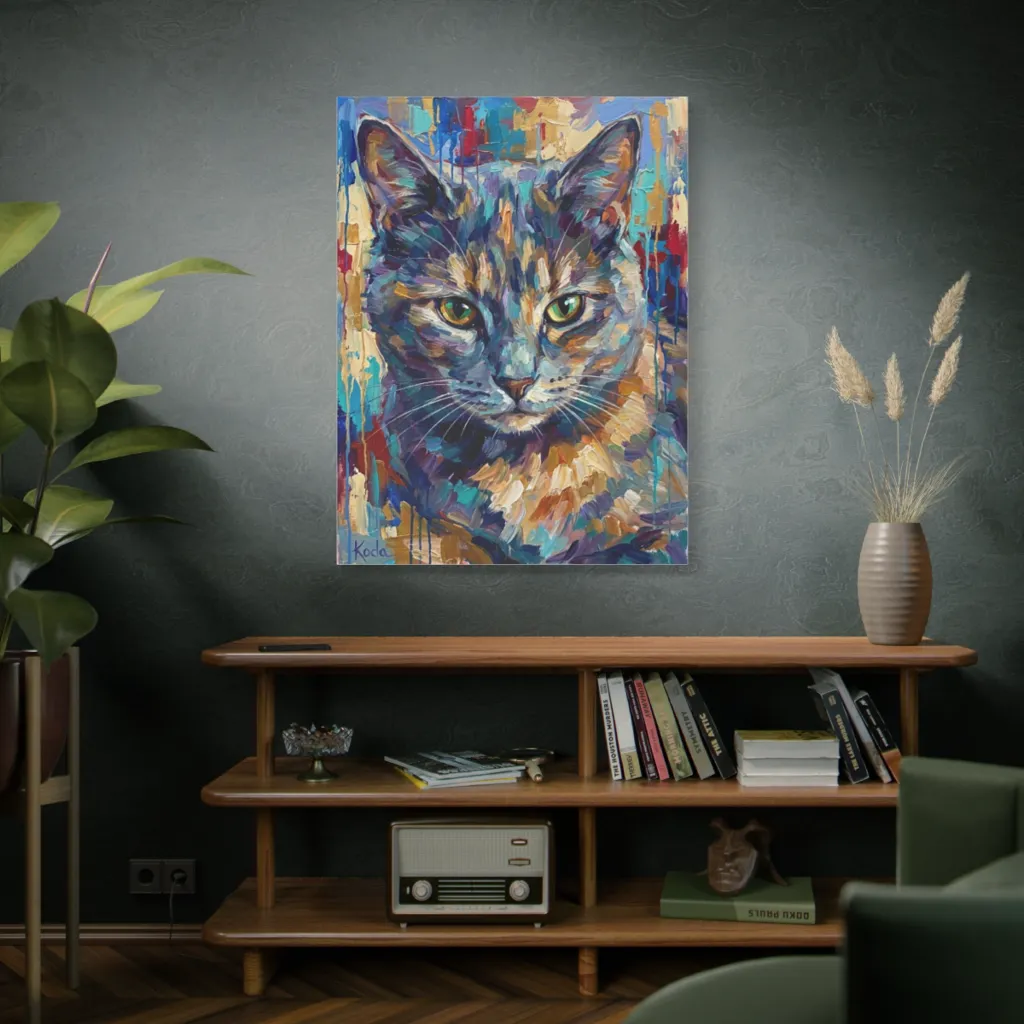 A kaleidoscope of impasto strokes and vibrant drips paints a captivating cat, whose emerald gaze holds a majestic, playful intensity.
