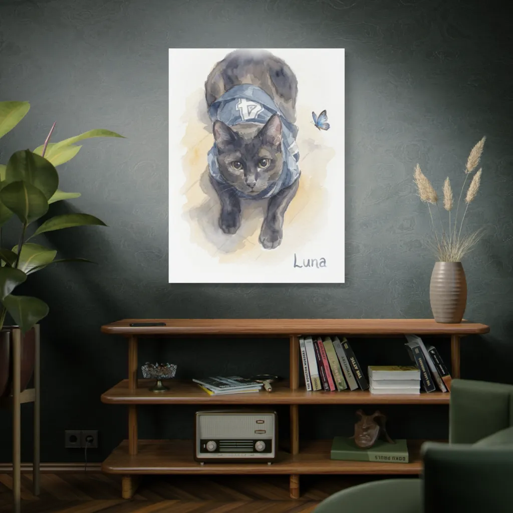 In whimsical watercolors, Luna, a charming cat in blue, playfully contemplates her next butterfly pounce.