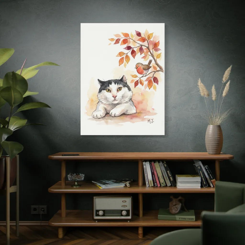 This charming watercolor captures a plump, watchful cat eyeing a cheerful robin perched on an autumnal branch, evoking cozy, gentle mischief. M.J.'s signature touch ensures this autumn scene is purr-fectly poised between cozy charm and potential, dare we say, a Thriller.