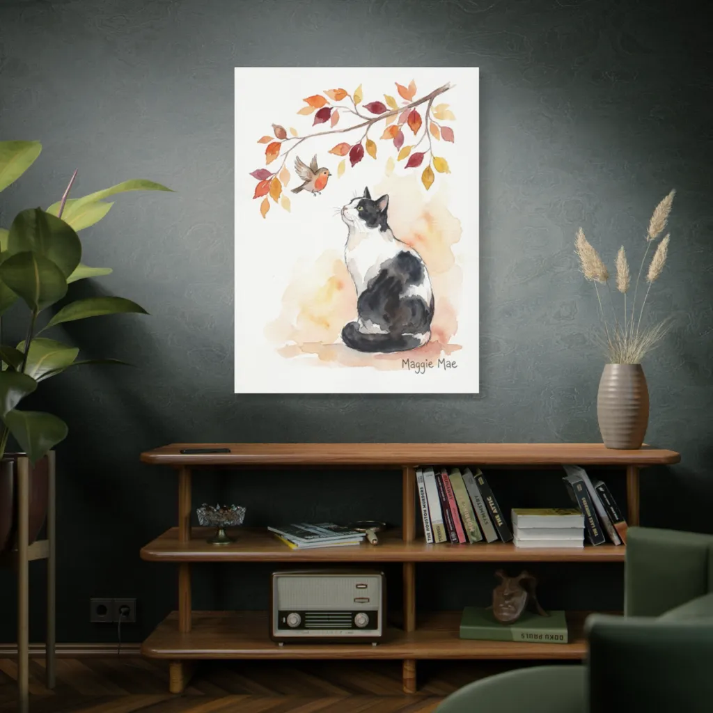 "Maggie Mae's Leafy Reverie" masterfully juxtaposes feline contemplation with avian vitality. The ethereal watercolor brushwork and tonal harmony evoke a visceral, almost avant-garde, autumnal drama. A Louvre-worthy study in existential longing.