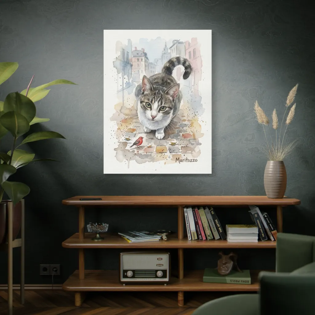Lively watercolors capture a watchful tabby eyeing a tiny bird on cobblestones, evoking a charming, urban curiosity. Maritozzo, the cat, finds this little bird far more tempting than any sweet, cream-filled bun.