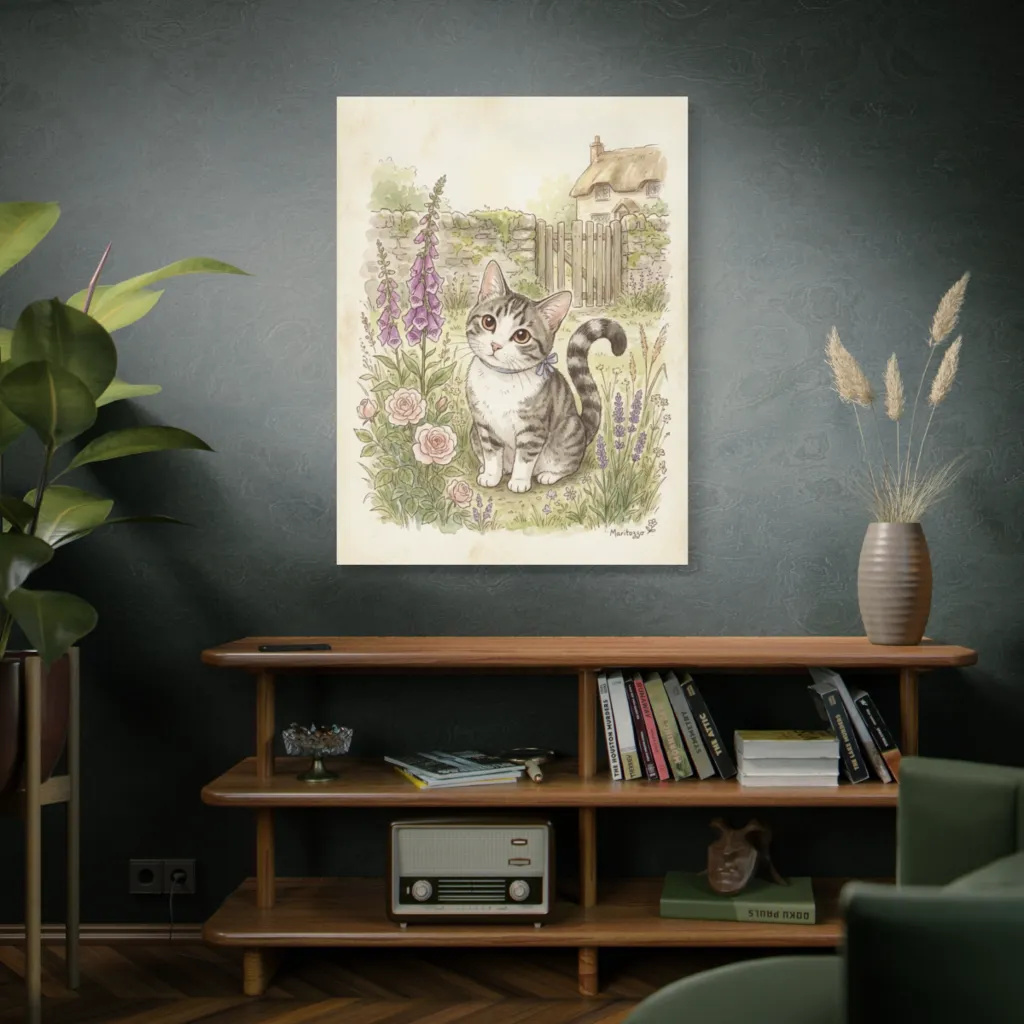 A Beatrix Potter-esque watercolor portrays a captivating kitten amidst an idyllic garden, radiating whimsical, storybook serenity. This adorable scene is almost as sweet as a Maritozzo, making you feel perfectly content.