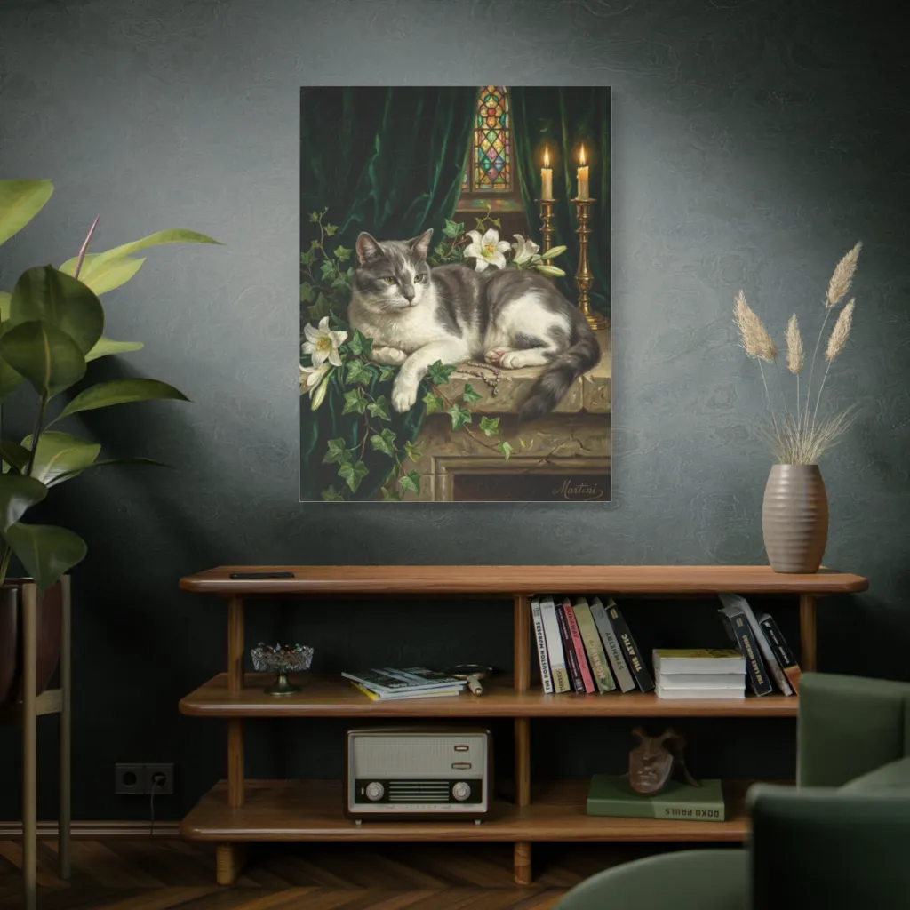 A sumptuously detailed classical oil painting depicts a regal cat amidst lilies, candles, and stained glass, evoking a mood of serene, quiet opulence.