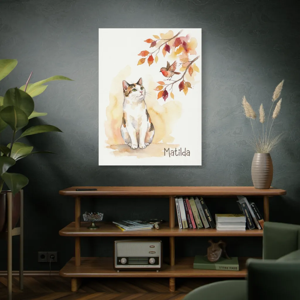 A charming watercolor portrays a curious calico cat mesmerized by a robin on an autumn branch, crafting a whimsical, serene scene.