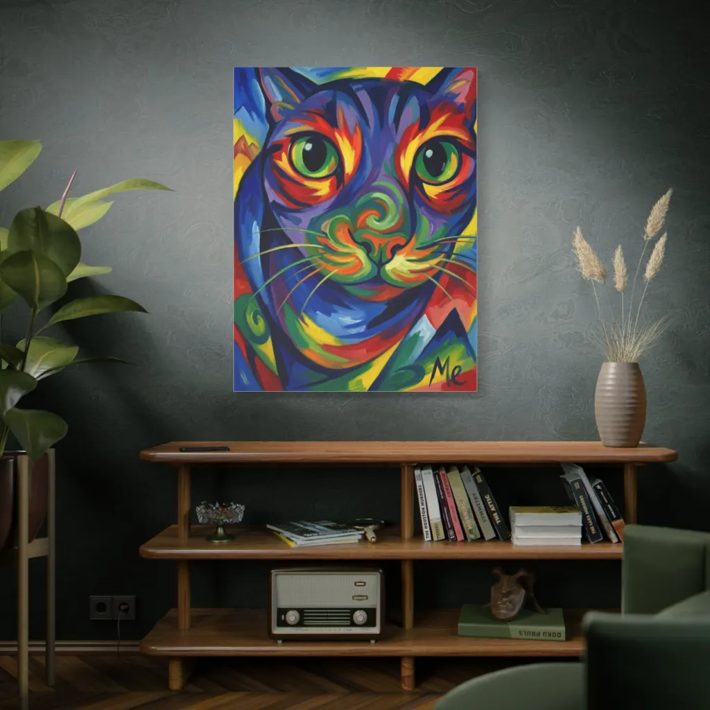 A bold, cubist cat portrait bursts with kaleidoscopic color and mesmerizing, playful intensity.