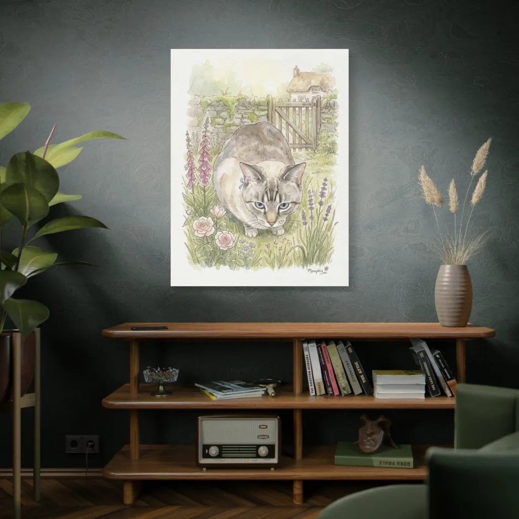 This digital watercolor masterfully merges traditional feline portraiture with a contemporary, innovative aesthetic. Memphis’s captivating gaze, rendered with bold digital strokes, redefines garden reverie.