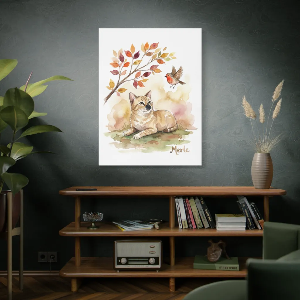 This whimsical watercolor captures a curious cat eyeing a robin amidst soft autumn foliage, evoking a gentle, playful mood. Merle, with a glint in his eye, seems to be politely asking the robin, "Mind if I join you for lunch?"