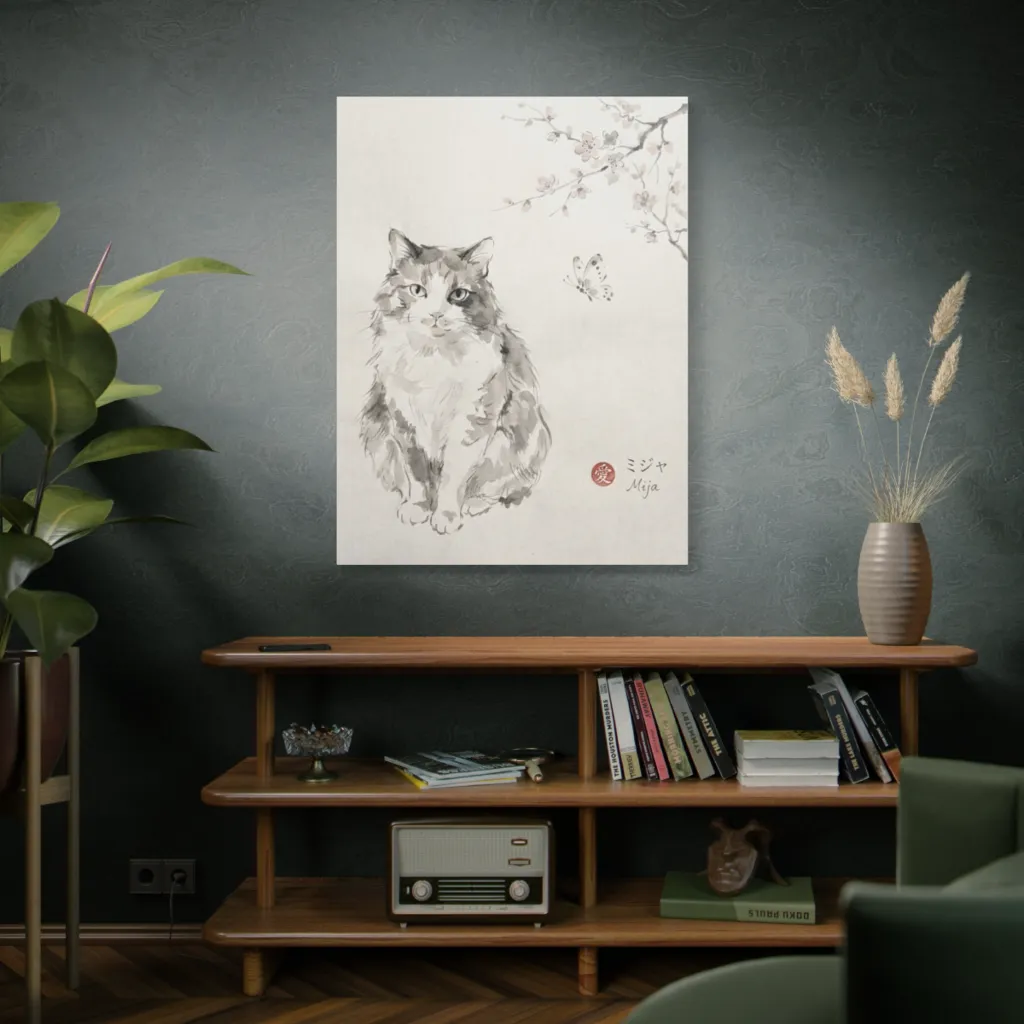 "Mija's Blossom Reverie" offers a masterful juxtaposition of ink wash serenity and impending feline viscerality. The tonal harmony evokes a poignant, avant-garde domesticity worthy of profound contemplation.
