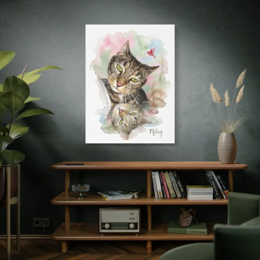 Dreamy watercolor captures a curious tabby and its reflection eyeing a tiny bird amidst soft washes, evoking gentle wonder. With piercing green eyes, Miley the cat's curious gaze suggests she's about to *wrecking ball* into mischief, bird or reflection be damned.