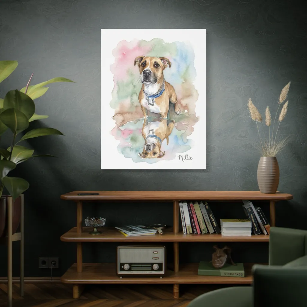 This innovative piece boldly redefines traditional portraiture. The contemporary watercolor technique, with its compelling reflection, creates a dynamic, almost interactive, digital aesthetic. It's a fresh, experimental take on self-perception.