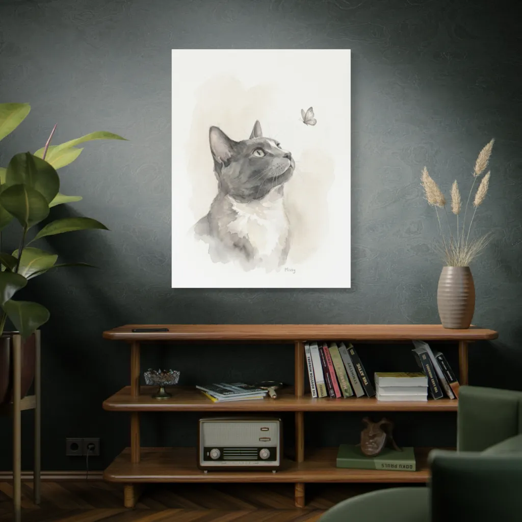 This ethereal watercolor portrays a cat's captivated stare at a delicate butterfly, brimming with gentle curiosity.