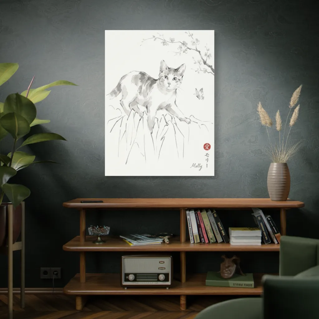 "Molly's Gentle Gaze" exhibits visceral tension through its tonal mastery. The sumi-e brushwork, a study in deceptive simplicity, juxtaposes ephemeral grace with avant-garde predatory contemplation. Truly, a feline 'Mona Lisa.'