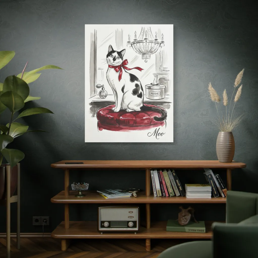 Moo, the ultimate feline fashionista, looks positively purr-fect on his crimson perch, ready for his close-up.