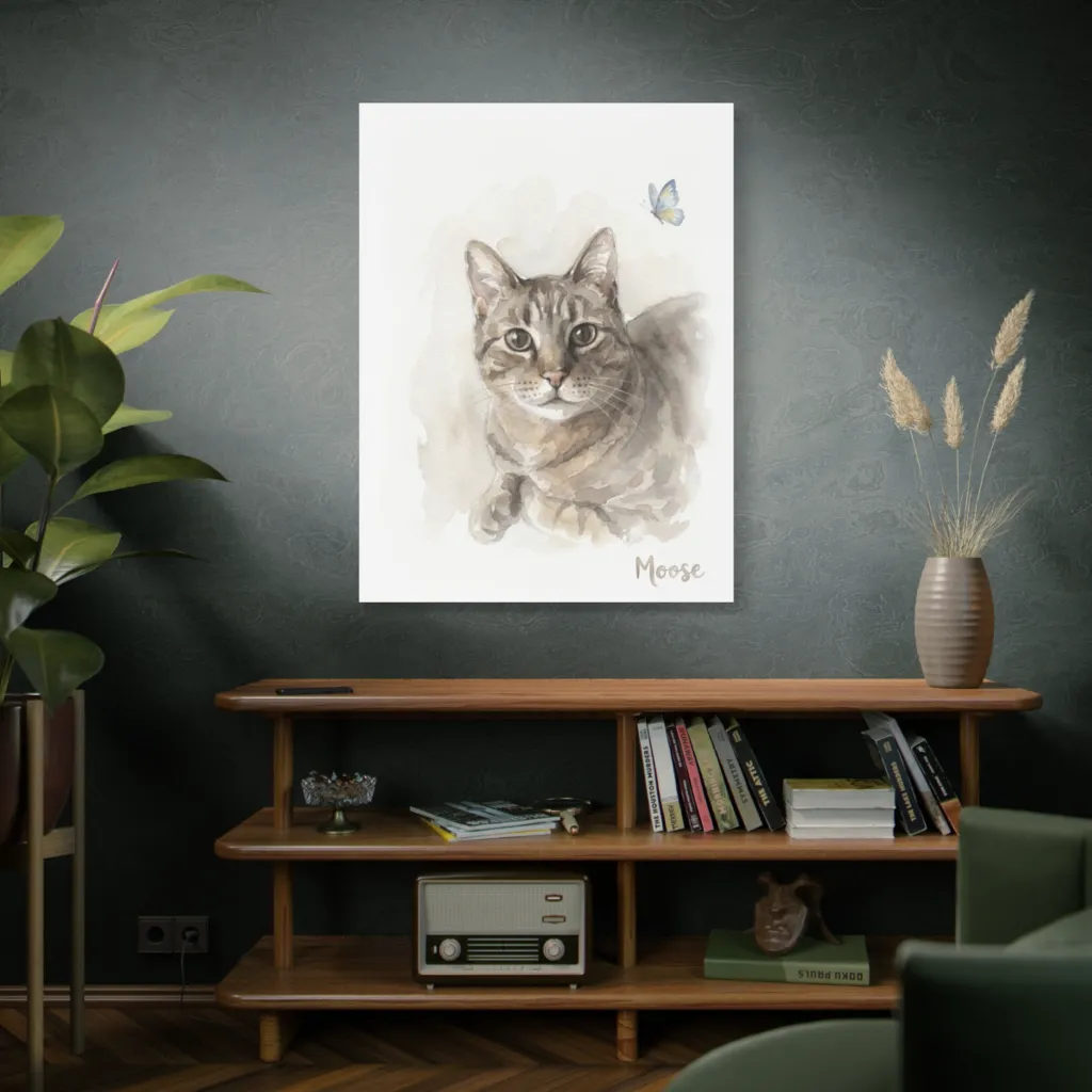 Moose's curious gaze beautifully captures his playful, gentle soul. The watercolor perfectly conveys his charming intensity, revealing a mischievous spirit poised for adventure. A truly special character portrait.