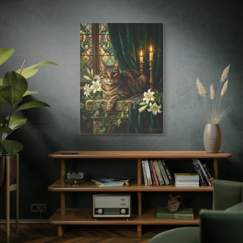 The warm golden candlelight creates a beautiful chromatic harmony against cool, desaturated gothic tones and silvery tabby grays. This masterful balance of saturation and complementary hues perfectly captures Moose's serene, regal mystery. Absolutely stunning color work!