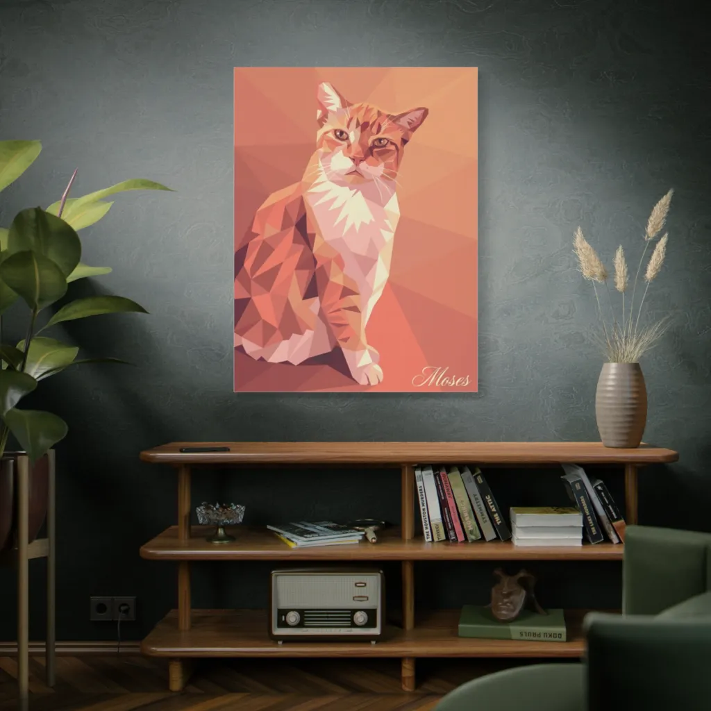 A stately ginger cat, geometrically rendered in warm, low-poly facets, gazes with serene, digital composure. Even biblical Moses would bow to this geometric ginger, whose regal gaze parts the sea of your artistic doubts.