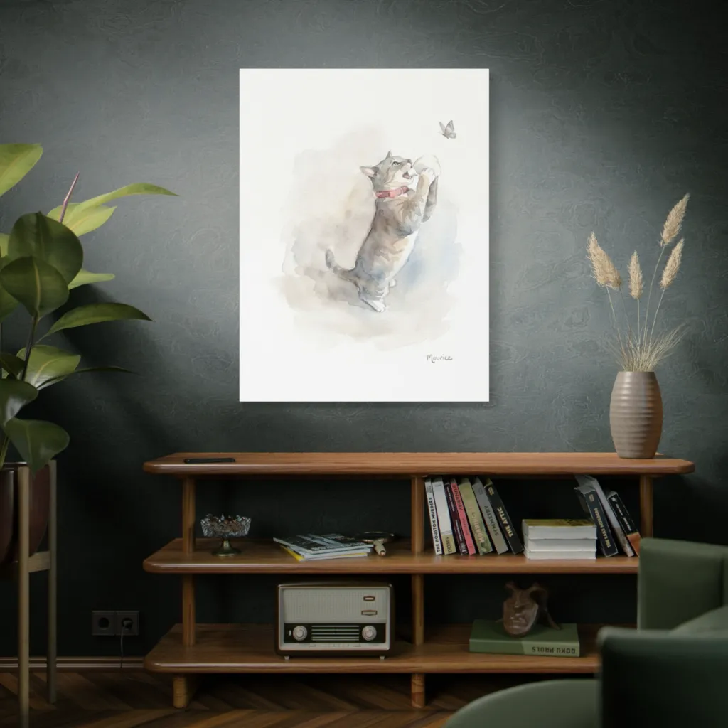 Soft watercolors capture a playful tabby cat mid-leap, reaching for a butterfly with charming, airy whimsy.