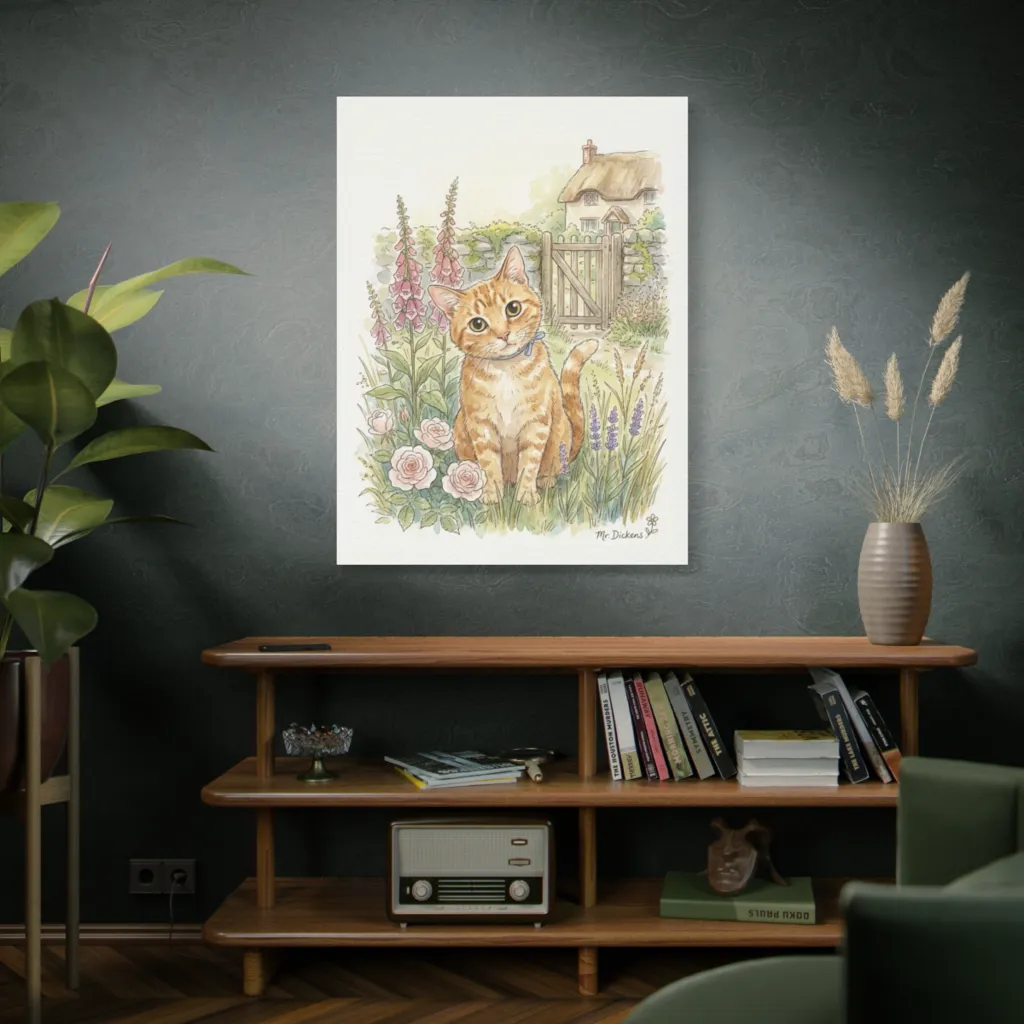 This composition commands attention with its charming presence. Mr. Dickens, a true 'Garden Sentinel,' evokes Pre-Raphaelite detail and an undeniable narrative quality. Exhibition-worthy distinction.
