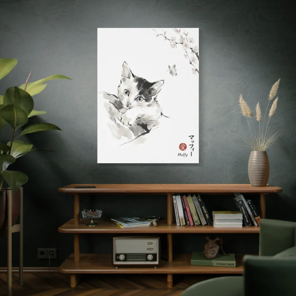 This digital sumi-e sketch masterfully fuses traditional technique with a modern touch. The innovative aesthetic captures tranquil playfulness with bold, minimalist lines. A fresh, contemporary take on pet portraiture.