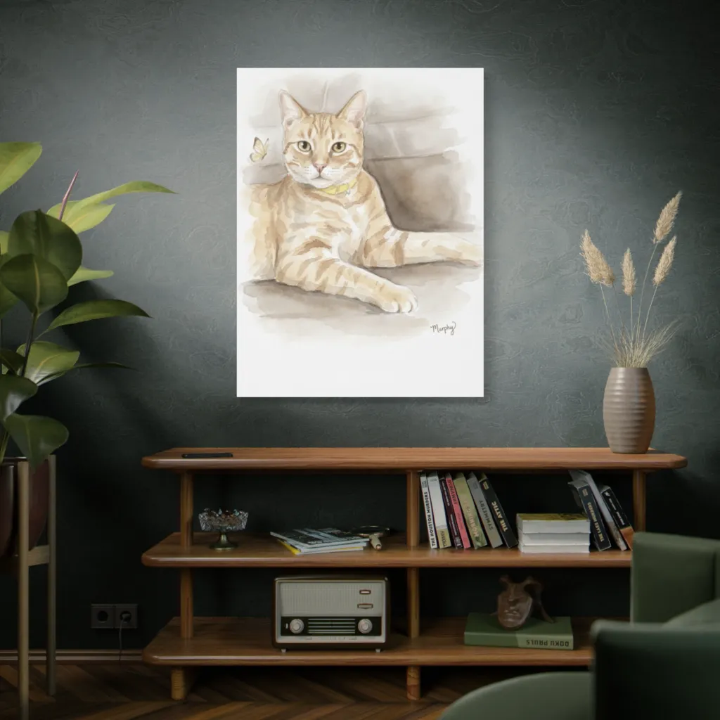 A soft watercolor captures a relaxed tabby cat eyeing a butterfly, creating a charming, serene moment. Murphy clearly believes a cat's purrfectly poised presence can halt even a butterfly mid-flight.