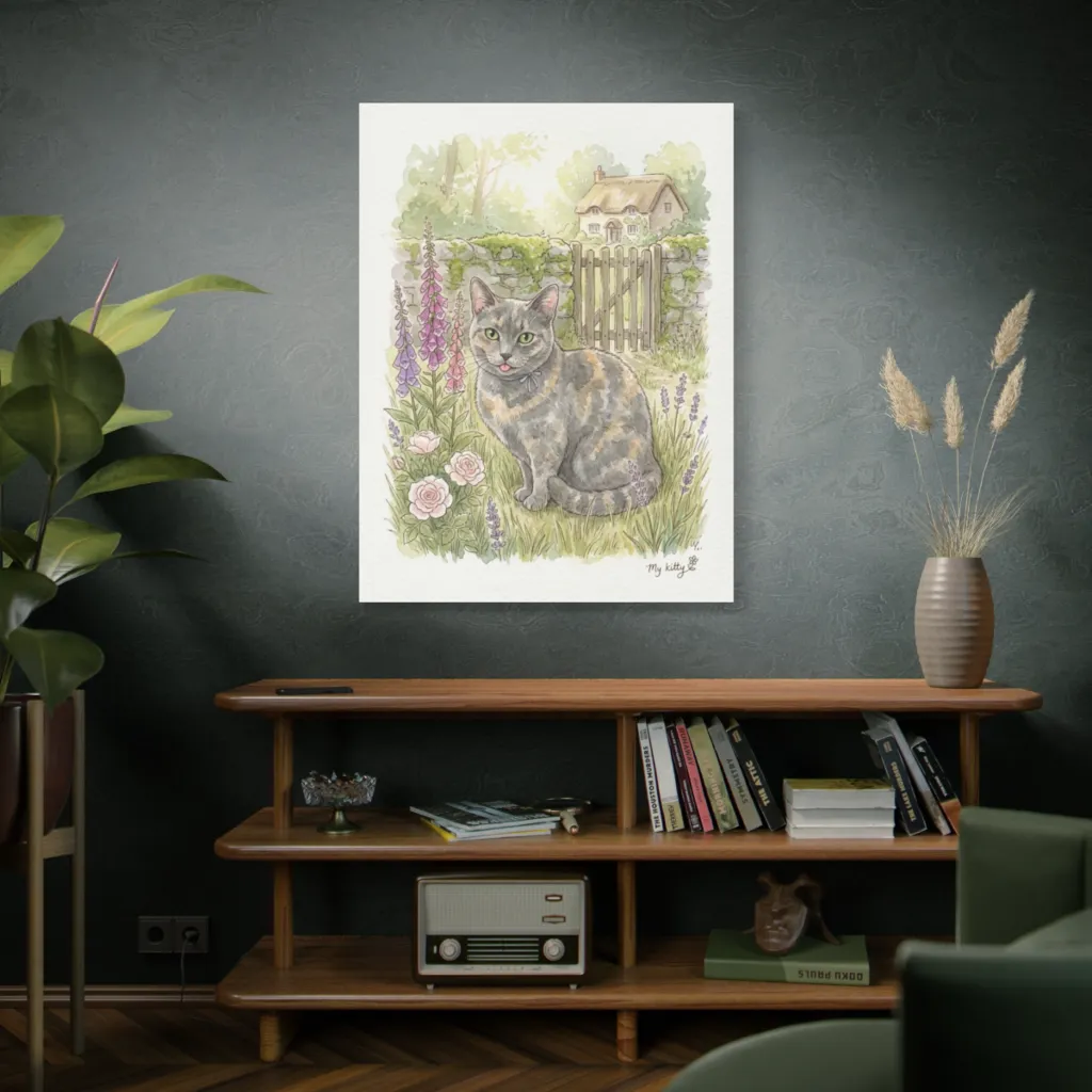 "My Kitty, Cottage Idyl" is a unique, conversation-starting piece. Its whimsical charm and emotional warmth offer lasting appeal, making it a treasured collection addition with wonderful display potential.