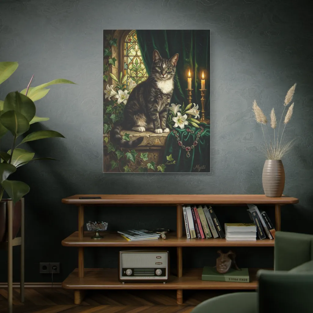 A sumptuously detailed, painterly scene portrays a regal tabby amidst lilies, glowing candles, and jewels, exuding serene, gothic opulence.