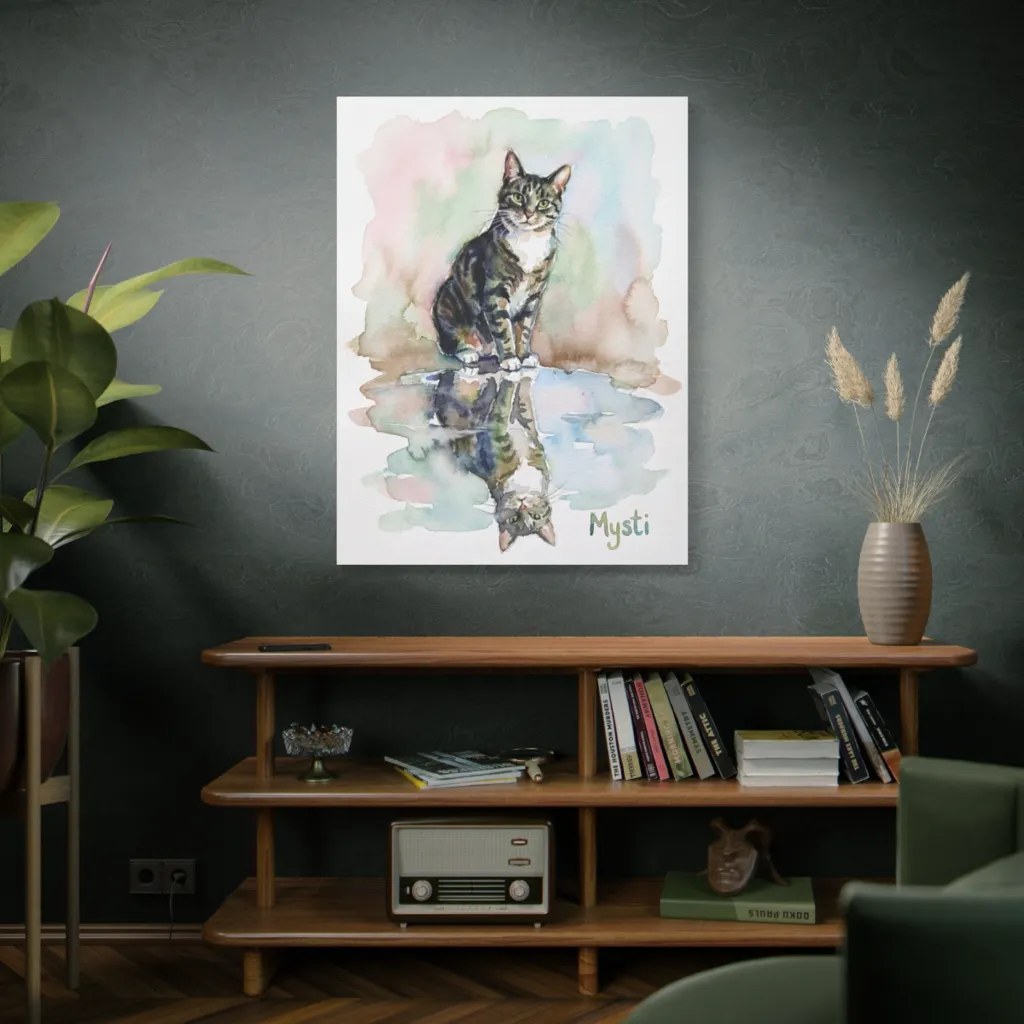 The fluid watercolor's tonal harmony brilliantly juxtaposes Mysti's regal essence with her ethereal reflection. A profound, avant-garde study in feline self-conquest, truly worthy of the Louvre's grandest contemplation. Utterly evocative.