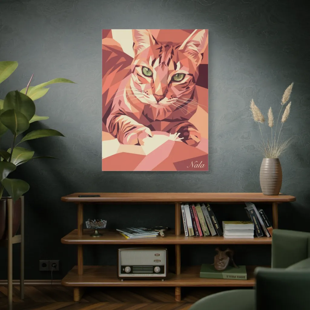 Nala's Emerald Gaze innovatively blends traditional pet portraiture with a striking digital mosaic. The sharp polygons and luminous eyes are a bold, contemporary statement, showcasing cutting-edge artistic technique beautifully.