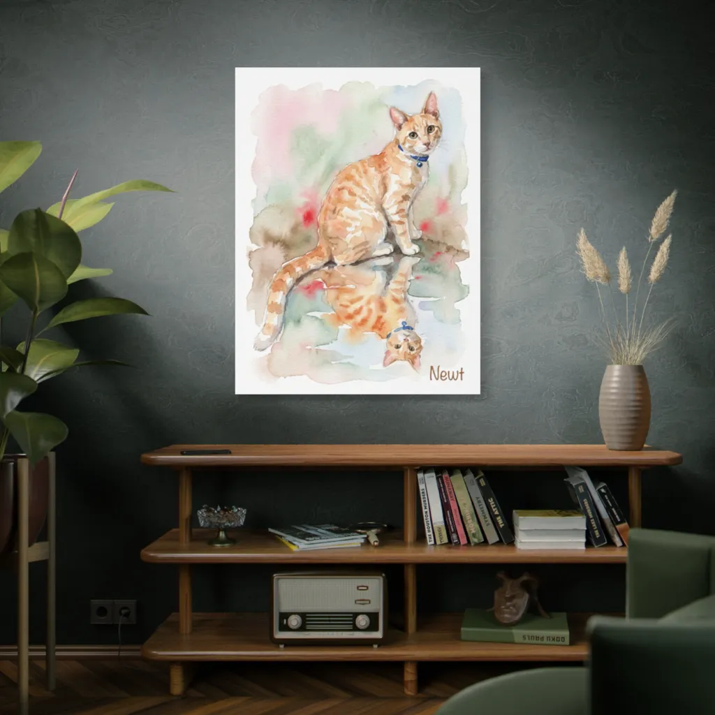 Newt's curious gaze and poised stance beautifully reveal his soulful, reflective nature. This watercolor perfectly captures his unique charm and whimsical spirit, making him truly special.