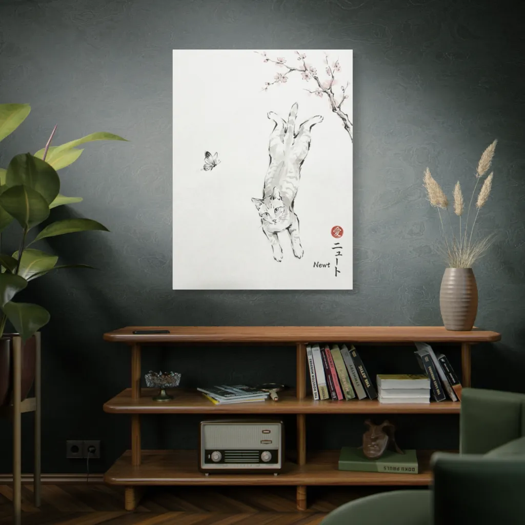 A whimsical sumi-e captures a curious tabby stretching towards a butterfly, framed by delicate cherry blossoms, evoking pure delight. Newt, with gravity-defying grace, spies a fluttering butterfly, plotting his next playful pounce.