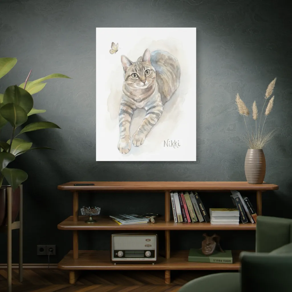 Delicate watercolors depict a curious tabby, poised with gentle wonder at a flitting butterfly, in a moment of whimsical calm. Nikki's wide-eyed watercolor stare makes one wonder if that butterfly is a friend or just a particularly fluttery snack.