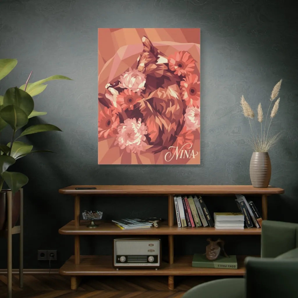 “Nina's Amber Slumber” brilliantly redefines pet portraiture. The innovative geometric polygons blend traditional serenity with a vibrant digital aesthetic, creating a truly captivating contemporary piece.