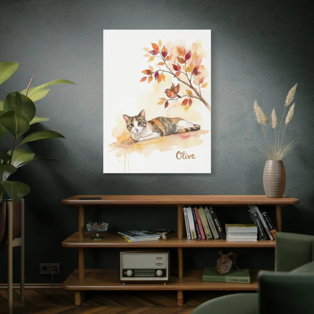 Olive's Autumn Reverie brilliantly merges traditional portraiture with playful, contemporary aesthetics. The whimsical composition and vibrant hues offer an innovative take on pet art. Fresh and captivating.