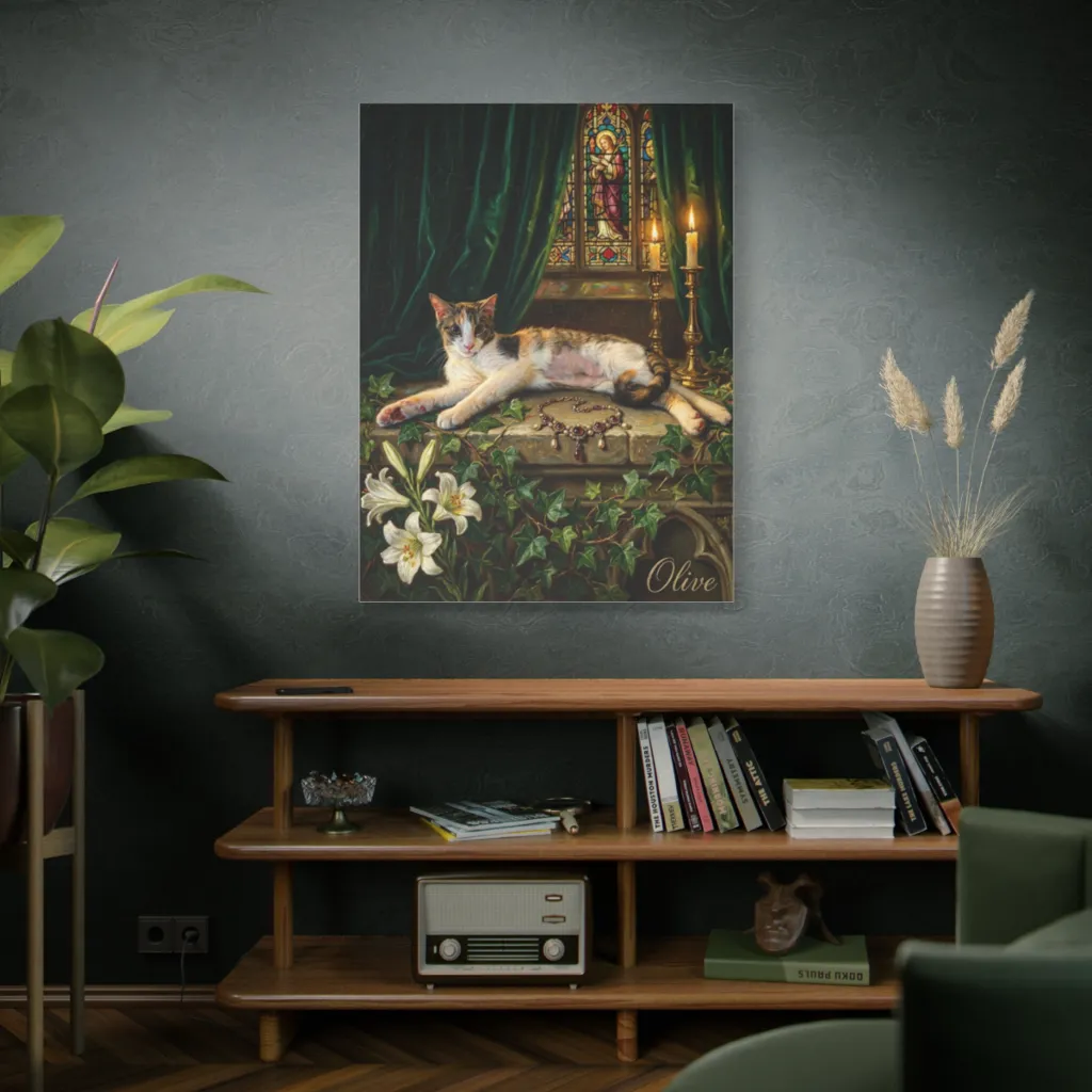 Olive's Gilded Vigil captures her mischievous, regal spirit perfectly. Her lounge amidst "sacred relics" reveals a delightful, self-important personality. A charming portrayal of Olive's unique, whimsical grandeur and soul.