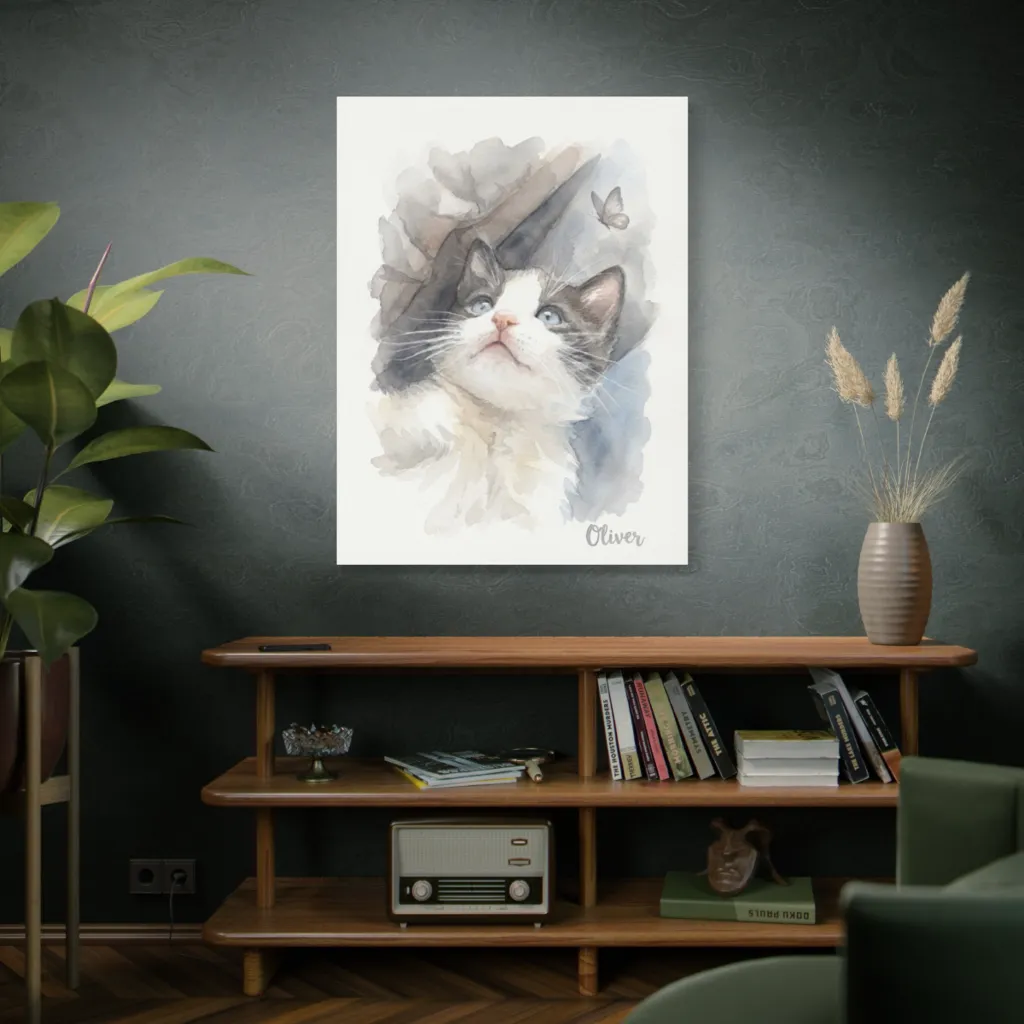 This digital watercolor masterfully merges classic portraiture with contemporary whimsy. Oliver's wonder, captured with innovative softness, reinvents traditional pet art through a cutting-edge, dreamlike lens.