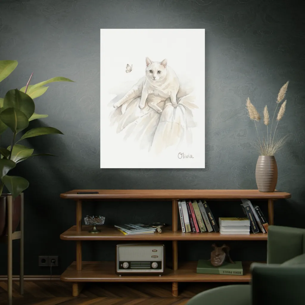 Soft, minimalist watercolor portrays a serene white cat intently eyeing a butterfly, evoking a peaceful, whimsical daydream.
