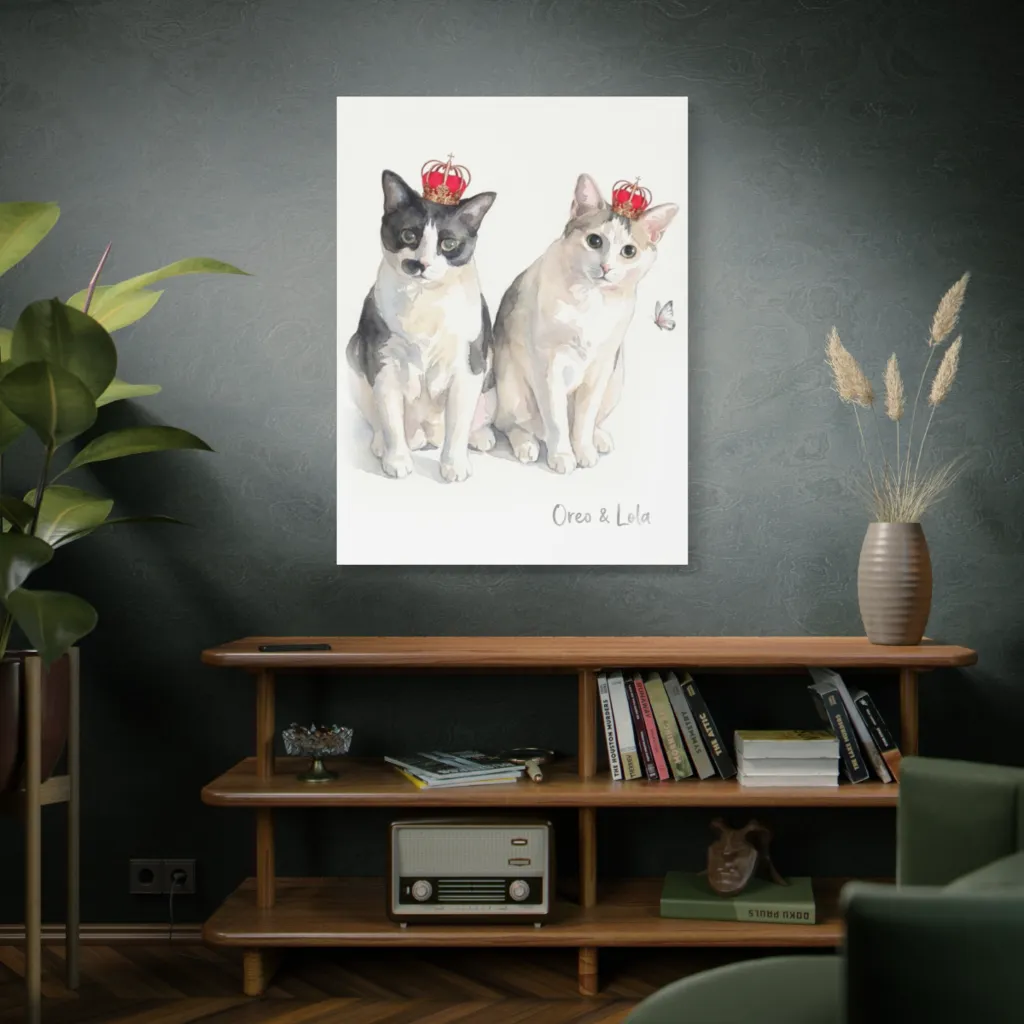 Crowned queens Oreo and Lola, rendered in soft watercolor, charmingly remind us who truly rules the serene, butterfly-filled roost.