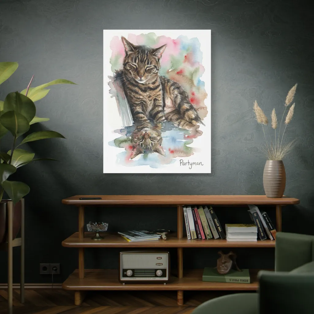 “Partyman's Gentle Reverie” brilliantly merges traditional feline portraiture with a digital-era softness. Its vibrant, soft-focus reflection technique is innovative, pushing watercolor into contemporary aesthetic realms.