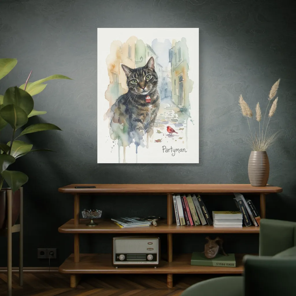 The watercolor's soft, desaturated primary palette beautifully balances warm tabby ochres with cool alley blues. Chromatic harmony creates a gentle whimsy, perfectly reflecting Partyman's festive, yet observant, character. Utterly masterful!