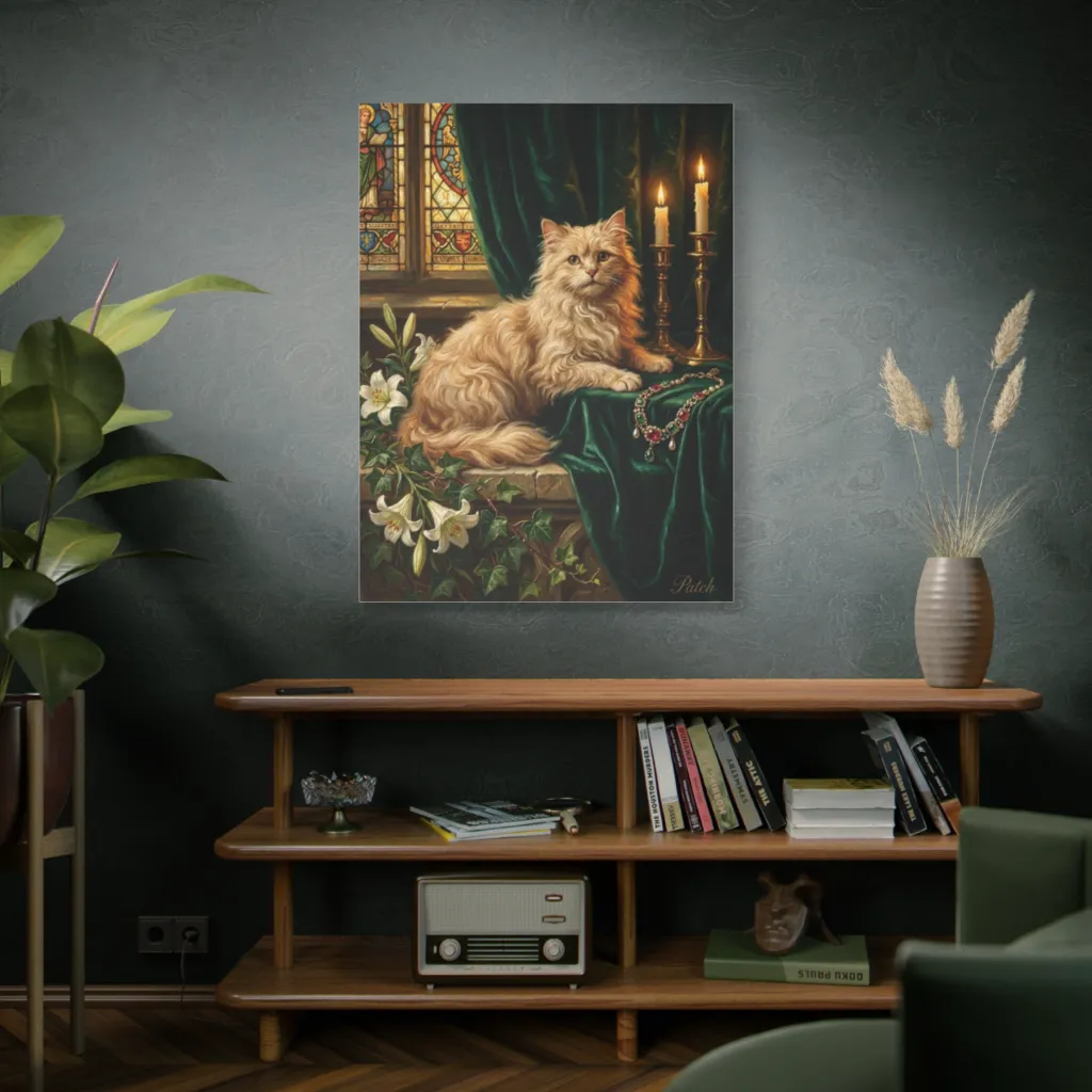 This piece is a masterful blend of feline grace and Gothic grandeur. Its unique narrative offers immense conversation value and lasting emotional depth, making it a treasured, investment-worthy acquisition.