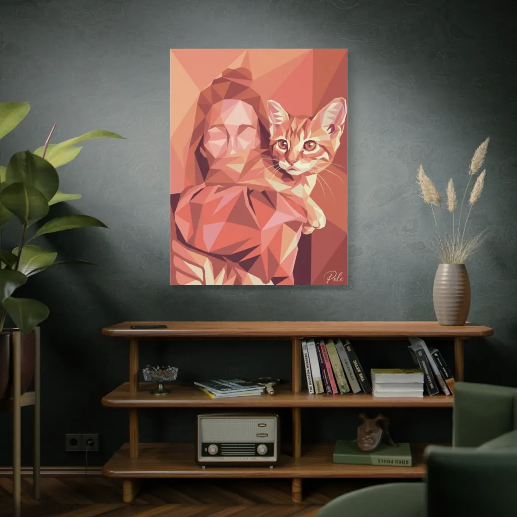 Geometric facets render a warm, loving scene of a person cradling an alert tabby, evoking serene companionship. This pixelated purr-fect portrait of feline affection is so charming, it'd make Pele himself kick up his heels in delight!