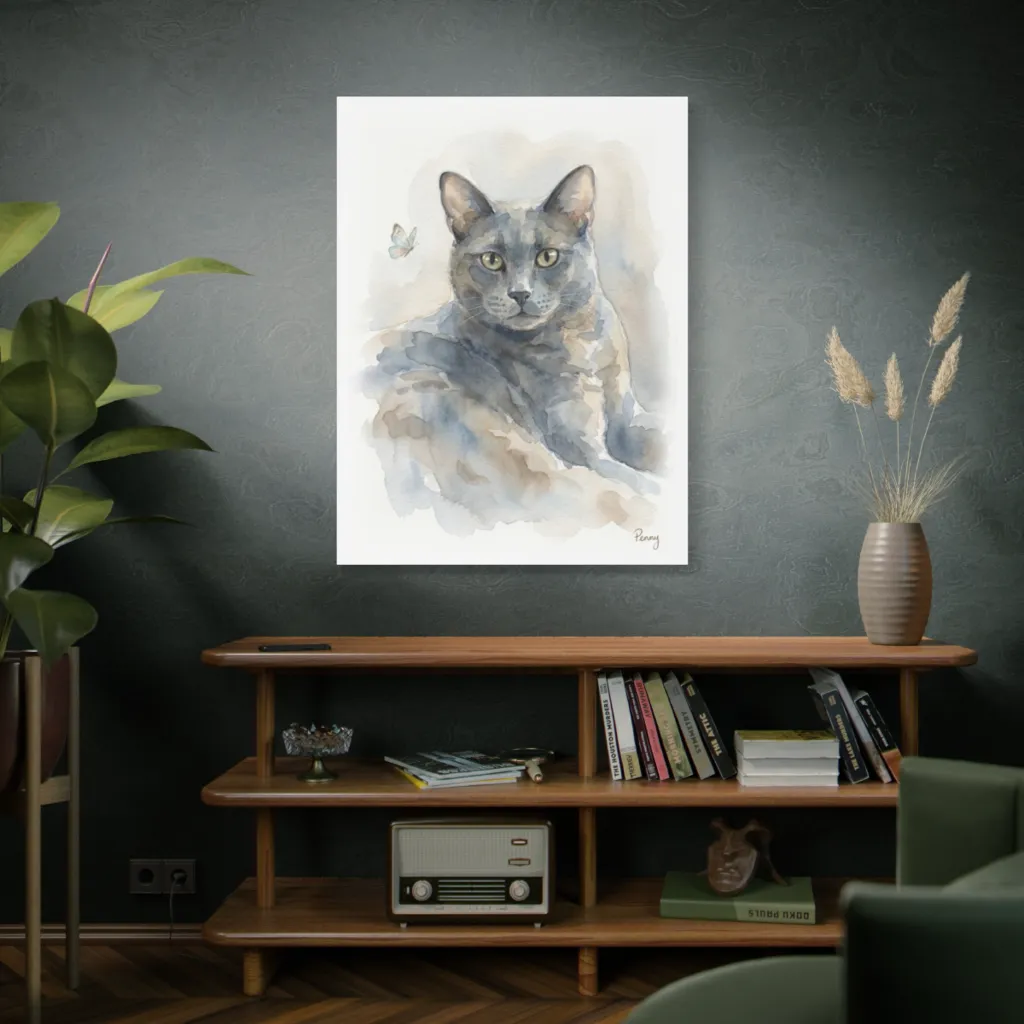 “Penny's Soft Vigil” is perfect above a raw oak console in a sun-drenched reading nook. Its serene watercolors and emerald eyes pair beautifully with brushed brass accents and linen textures, creating an inviting, chic oasis.