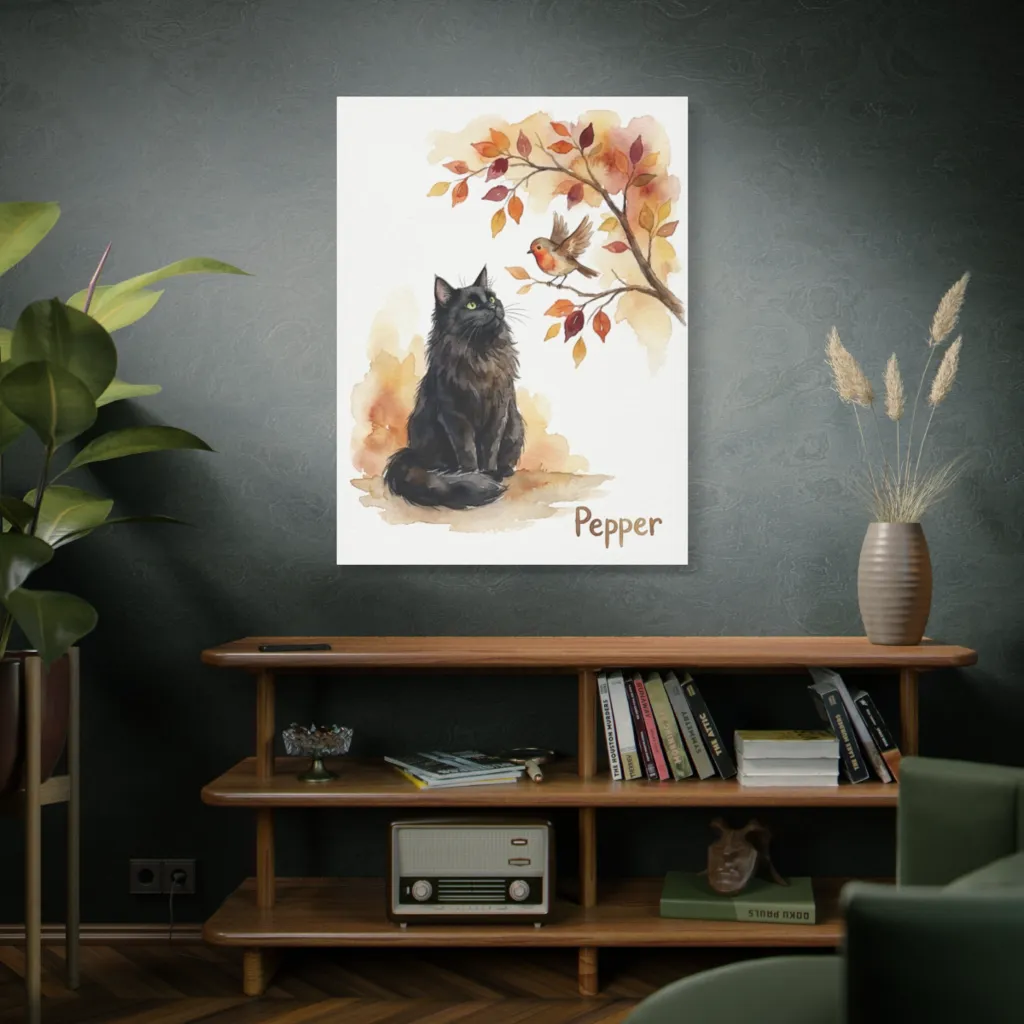 This unique watercolor offers profound emotional resonance and excellent display potential. Its whimsical charm creates lasting appeal, making 'Pepper's Autumn Reverie' a treasured, conversation-starting addition to any discerning collection.