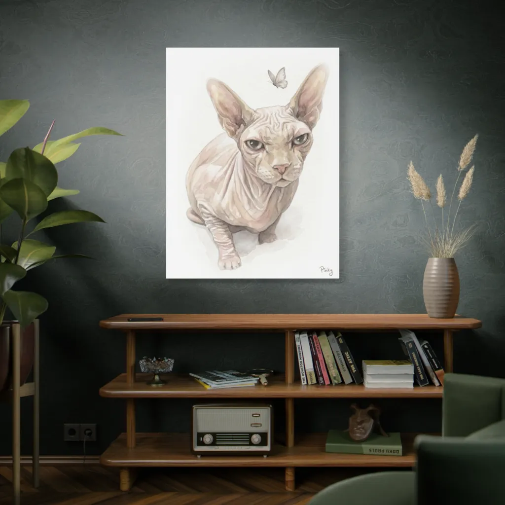 A luminous watercolor captures a curious Sphynx cat’s intense, wrinkled stare at a delicate butterfly, balancing solemnity with fleeting wonder.