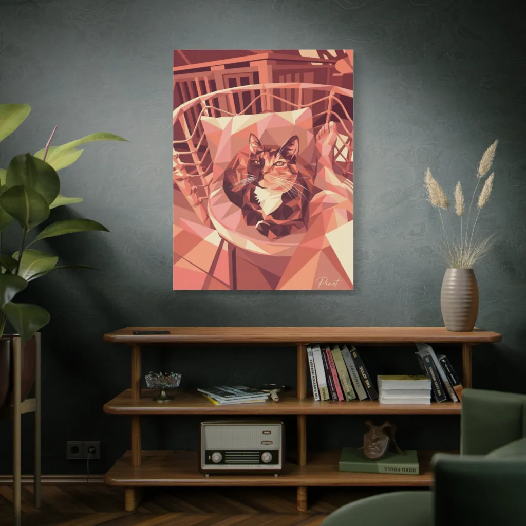Low-poly warmth envelops a regal cat lounging comfortably, its gaze a witty blend of cozy domesticity and feline sass. This geometrically sharp cat commands attention, making even a glass of Pinot feel like a secondary character in its cozy dominion.