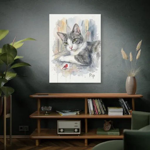 This charming watercolor captures a serene cat beneath autumn leaves, thoughtfully observing a cheeky robin in a soft, whimsical scene. Pip, with an air of dignified nonchalance, seems to be plotting either a nap or a very gentle pounce on that unsuspecting robin.