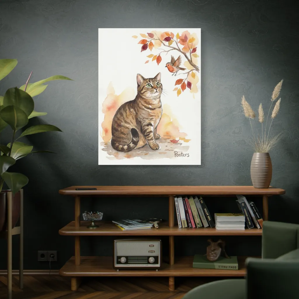 A charming watercolor depicts a curious tabby cat captivated by a robin beneath a branch of soft autumn leaves, evoking gentle wonder. Pooters, clearly amused, perfectly captures this tabby's hopeful gaze at a plump autumn snack.